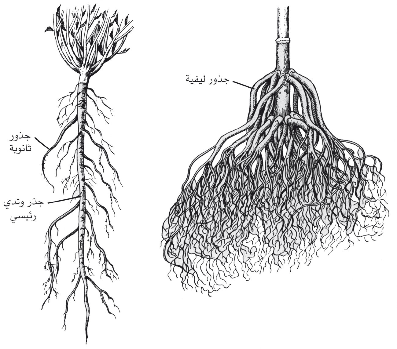 الشكل (1) يوضح نموذجي الجذور اليمين نموذج الجذور الليفية المعترضة في النباتات أحادية الفلقة، اليسار نموذج الجذور الوتدية في النباتات ثنائية الفلقة