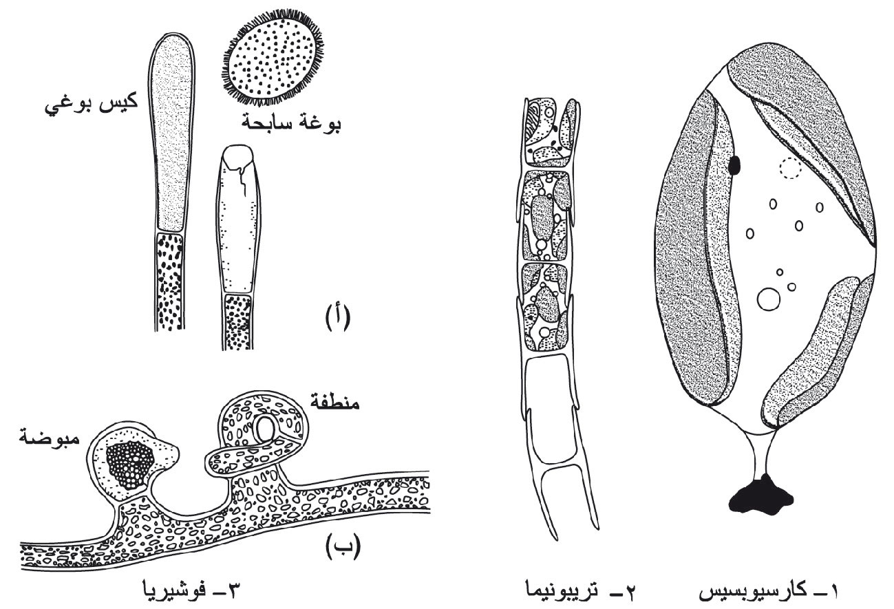 1 ـ كارسيوبسيس Characiopsis ء2 ـ تريبونيما Triponema ء3 ـ فوشيريا Vaucheria أ ـ التكاثر اللاجنسي ب ـ التكاثر الجنسي الشكل (1) أبرز أجناس الطحالب اليصفورية |