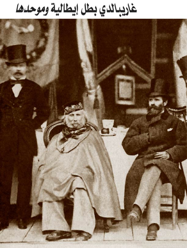 ب ـ غاريبالدي وتحرير صقلية: جمع غاريبالدي[ر] 1080 متطوعاً من جنوة وألبسهم قمصاناً حمراء وعبر بهم إلى صقلية حيث هزم جيش نابولي، ثم غزا نابولي ودخلها وحرر مع جيش الملك فكتور عمانوئيل الحصون الشمالية، في حين توجه كافور بجيش لقتال جيش البابا وانتصر عليه واحتل الأملاك البابوية عدا رومة، وفي 18شباط1861 اجتمع المجلس النيابي الجديد ونودي بفكتور عمانوئيل ملكاً على إيطالية.