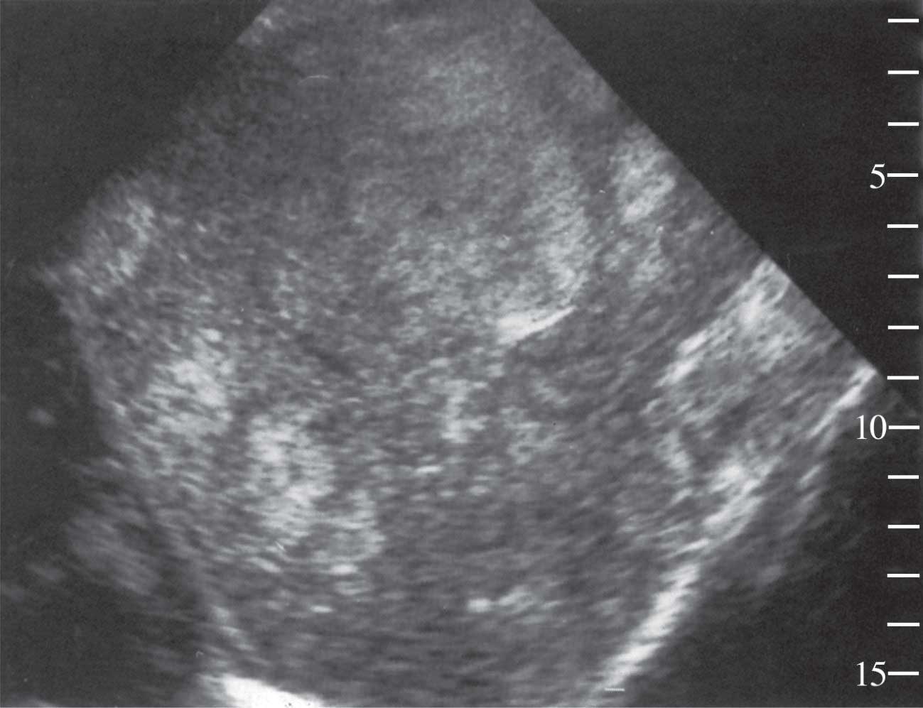 | الشكل (3) سرطانة الخلية الكبدية متعددة البؤر تقلد النقائل الكبدية. يبين المقطع السهمي للكبد بتخطيط الصدى وجود عدة كتل ورمية زائدة الصدى |