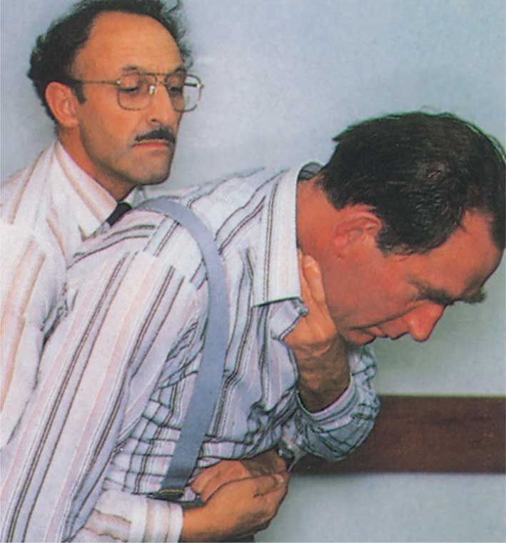 الشكل (3) مناورة هيملخ The Heimlich manoeuvre وهي محاولة لإزالة الجسم الأجنبي المستنشق، وفيها تطبق إحدى اليدين على الشرسوف وتوضع اليد الأخرى فوقها، ومن ثم يضغط المريض فجأة بحيث تندفع قبضة اليد إلى الأعلى والخلف مسببة خروج الهواء من الرئتين بعنف. | الشكل (4) خزع الغشاء الحلقي الدرقي Cricothyrotomy ويطبق بوصفه سهماً أخيراً في حال الاختناق الانسدادي حين يكون من المستحيل تنبيب الرغامى بسبب وجود الجسم الأجنبي، أو الوذمة، أو عدم توافر الأدوات. والعلامة السطحية لإدخال الإبرة هي الفراغ الواقع بين الغدة الدرقية والغضروف الحلقي. ويجب مص المحقن بعد إدخال الإبرة للتأكد من دخول الإبرة والقنية ضمن لمعة الرغامى، ومن ثم تسحب الإبرة والمحقنة، وتترك القنية في مكانها |