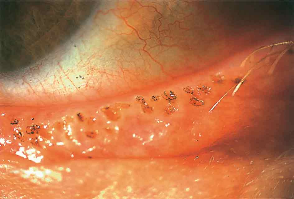 -2 مزمناً: يتصف باحتقان بسيط، وحكة معتدلة، وتسمك في جلد الجفن. ويعالج بالصادات، مع محاولة استبعاد العوامل الممرضة المسببة.