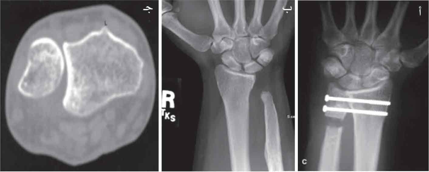 (الشكل3): الصورة الشعاعية: أ-أمامية خلفية، ب- نفق الرسغ، ج- جانبية |