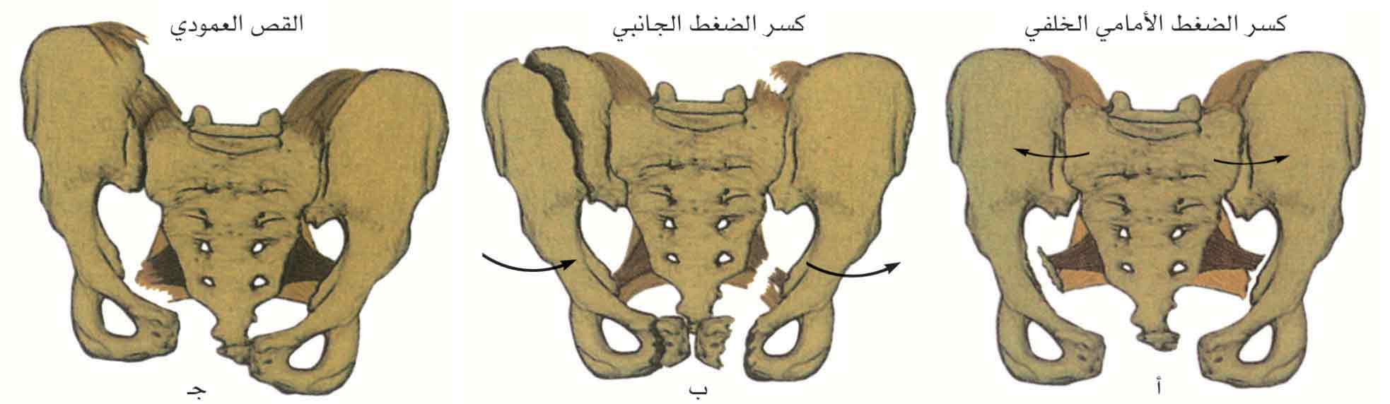 -1 كسور الضغط الأمامي الخلفي: تنجم كسور الضغط الأمامي الخلفي عن صدمة مباشرة من الأمام، وغالباً ما تتناول شعبتي العانة أو الوصل العاني (افتراق عاني)، وتؤدي إلى تباعد الحرقفتين بطريقة الكتاب المفتوح؛ مع ما يرافق ذلك من تمزق الأربطة الحرقفية العجزية الأمامية أو تمططها أو كسر الحافة الخلفية للحرقفة أو جناح العجز.