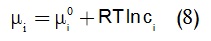 وتصبح عبارة الكمون الكيميائي في حالة النوع الإيوني i في محلول يسلك سلوك محلول مثالي كما في المعادلة (8):
