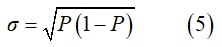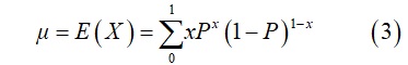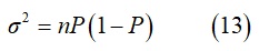 أما التباين variance فيعطى بالعلاقة (4)، وتكون قيمته مساوية للقيمة p(1-P):