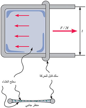 في الواقع يعود سبب هذا التعريف إلى إحدى طرائق قياس المعامل الذي يوضحها الشكل (3). تغمر الأداة الموضحة في الشكل بالسائل المراد قياس توتره ثم ترفع فيتشكل غشاء من السائل ذي السطحين، ويقاس توتره السطحي بقياس القوة F التي تجعل السلك القابل للتدحرج على سكتين متوازناً؛ ليعاكس جر السائل للسلك نحو اليسار مع ملاحظة أن للسائل سطحين في هذه الحالة، وعلى ذلك تكون المعادلة (3):