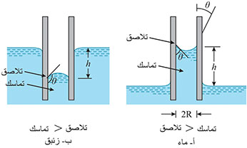 زاوية الالتصاق بين السائل ومادة الوعاء، وهي الزاوية بين سطح الجسم الصلب والمماس لقطرة السائل (الشكل 5). وفي حال كان السائل المستخدم هو الماء المقطر أو الكحول تكون قيمة الزاوية معدومة؛ أي