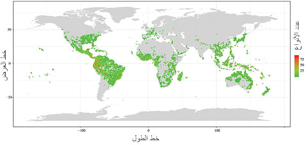 الشكل (5) التوزع الجغرافي للفصيلة التوتية في العالم. |