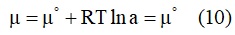 وتصبح عبارة الكمون الكيميائي في حالة مكوِّن صلب أو سائل نقي كما في المعادلة (10):