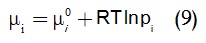 وتصبح عبارة الكمون الكيميائي في حالة النوع الغازي i في مزيج غازي يسلك سلوك الغازات الكاملة كما في المعادلة (9):