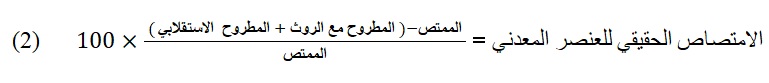 يُمثل الفارق بين الامتصاص والإطراح اختفاء العنصر المعدني من الجهاز الهضمي؛ لكنه لا يأخذ بالحسبان كمية العنصر الموجود في البراز التي تنتج من حكّ الخلايا المخاطية أو من إرجاع العنصر إلى الجهاز الهضمي. ويصحح الامتصاص الحقيقي كلاً من كمية العنصر الممتص فعلاً من قبل جسم الحيوان، والكمية الراجعة إلى الجهاز المعدي المعوي التي تُسمى بالبراز الاستقلابي المطروح وتتكون من قسم لا يمكن الاستفادة منه ويطرح من جسم الحيوان، وقسم آخر يمكن أن يؤثر في امتصاص العنصر المعدني وتوفره مع أنه قد لا يكون مسؤولاً عن الوظائف الرئيسة في جسم الحيوان، علماً أنه لا يمكن فصل القسمين السابقين كيميائياً، ويمثّل الامتصاص الحقيقي للعنصر المعدني الامتصاص الكلي مطروحاً من البراز الكلي المطروح منه البراز الاستقلابي وفق المعادلة (2):