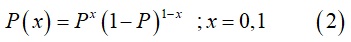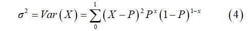 أما التباين variance فيعطى بالعلاقة (4)، وتكون قيمته مساوية للقيمة p(1-P):