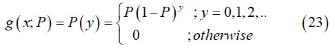 بالتوزيع الهندسي geometric distribution؛ لأن حدود المتتالية تشكل متتالية هندسية geometric series، ويرمز إلى هذا التوزيع بالرمز g(x,P)، ويعطى بالعلاقة (23):