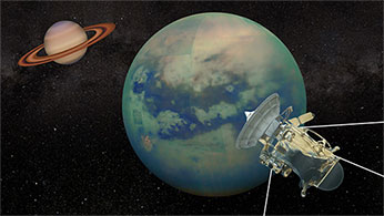 وتيتان هو عالَم بارد محاط بغلاف جوي سميك وضبابي hazyجعل من الصعب على المقاريب telescopes وأجهزة التصوير الأرضية استطلاعه. يتميز تيتان بكونه القمر الوحيد في المنظومة (المجموعة) الشمسية الذي يُعرف عنه امتلاكه لغلاف جوي سميك شبيه بالأغلفة الجوية للكواكب. وتيتان هو المكان الوحيد إلى جانب كوكب الأرض الذي يمتلك سوائل على سطحه. كما أن له سحب، ومطر، وأنهار، وبحيرات، وبحور من الهدروكربونات السائلة مثل الميتان methane والإيتان ethane.