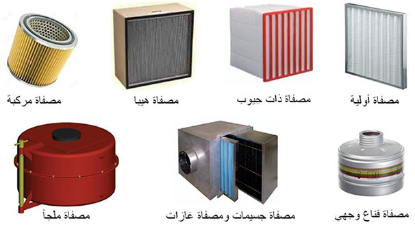 أ. مصافي الهواء ذات الكفاءة العالية high-efficiency particulate air filter: تنقي الهواء من الجسيمات الدقيقة بكفاءة عالية؛ حتى 99.97% للجسيمات التي يزيد قطرها على 0.3 مكرومتر.
