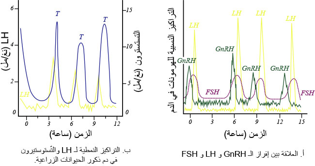 ونظراً لعدم تطور المركز الذروي surge center لإفراز الـ GnRH في المهاد عند الذكور؛ فإن إفرازه في الذكور البالغة يظهر بشكل اندفاعات متقطعة قصيرة (عدة دقائق) ومستمرة خلال الليل والنهار مسببة إفراز الـ LH بشكل ذروات متسلسلة ولاحقة، وأعلى من نظيراتها الخاصة بالـGnRH (الشكل15-أ). وتستغرق كل ذروة من ذرا الـ LHعادة نحو 10-20 دقيقة، وتحدث بمعدل 4-8 مرات/ يوم. تستجيب خـلايا ليديـغ لـ LH بإفراز التِّستوستيرون بشكل ذرا عالية متلاحقة ومتسلسلة بعـد مرور 30 دقيقة من كل اندفاع خاص بهرمون الـ LH (الشكل 15-ب). أما مستوى إفراز الـ FSH فيكون أقل بسبب التأثير السلبي للإنهِبين في إفراز الـ FSH، ولكن تكون ذراه أعرض من ذرا الـLH بسبب زيادة طول فترة حياة الـ FSH. وتبين أن إفراز الـ LH بشكله النبضي المتكرر الدائـم والقصيـر المدى (10-20 دقيقة) يُعدّ ضرورياً لسببين: أولهما المسـاعدة على إفراز التِّستوستيرون وتراكمه على مستوى الأنيبات المنوية بتراكيز أكبر بنحو 100-150 مرّة من مستواه في الدم؛ مما يجعله ضرورياً لاستمرار عملية تكون النطف، وثانيهما أن خلايا ليديغ تصبح رافضة (حرونةً) refractory لهرمون الـ LH بسبب انخفاض عدد مستقبلاته على سطحها؛ ولهذا يظهر انخفاض بمستوى التِّستوستيرون عندما يكون مستوى الـ LH عالياً، والعكس صحيح. كما تبين أن التِّستوستيرون المفرز خارج الخصى يتمدد بنحو 500 مرّة عندما يصل إلى الدم؛ مما يجعل تركيزه في الدم الجهازي منخفضاً، فيقلل من أثر التغذية العكسية السلبية في إفراز الـ GnRH، والـ LH على مستوى الوطاء والنخامية الغدية؛ على التوالي.