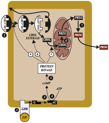 - ينشط cAMP سلسلة من إنزيمات شلالية protein cascade enzymes (الخطوة 5)؛ اذ ينشط الإنزيم الأول (a) فكّ معقد الكولِسترول المؤستر والـ LDL مع المستقبل وتحرر الأخير وإعادة دورته. وينشط الإنزيم الثاني (b) تحرر الكولِسترول من الإستر، وينشط الإنزيم الثالث (c) دخول الكولِسترول إلى المتقدرات الخلوية (الميتوكندريا) في خلايا الجسم الأصفر.