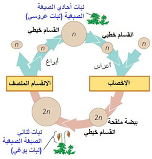 | الشكل (3) دورة الحياة الأحادية المضاعفة لدى النباتات وبعض الطحالب. |