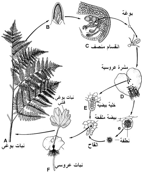 ب- سيطرة الجيل البوغي sporophytic: يسود النبات البوغي على النبات العروسي في السراخس والنباتات البذرية، مع بقاء الاختلاف بينهما فيما إذا كان الطور العروسي المختزل يعيش حياة حرة أو لا؟ مثلاً يستطيع كل من النبات البوغي والنبات العروسي في السراخس العيش بصورة مستقلة، لكن الشكل السائد والمشاهَد في الطبيعة هو ما يكون غالباً بشكل مُشَيْرة prothallus خنثوية تحمل المناطف والأرحام معاً (الشكل 6).