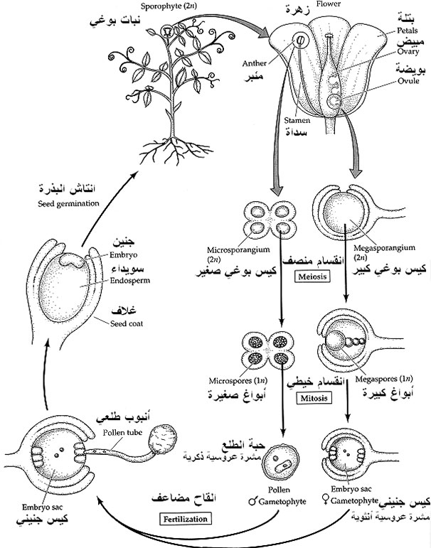 | الشكل (7) دورة حياة مغلفات البذور: تُلاحظ السيطرة شبه المُطلقة للنبات البوغي (جذر، ساق، أوراق) على النبات العروسي الذي يتوضع داخل الأعضاء الجنسية في الزهرة، ويتكون من خلايا محدودة العدد. |
