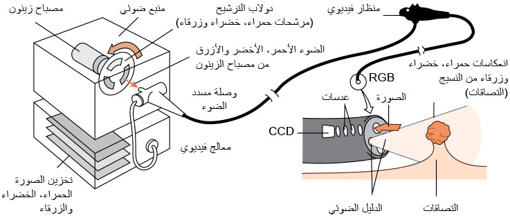 يتم الحصول على الصورة الملونة في منظومة المناظير الفيديوية بتطبيق إضاءة لونية من تتابع الألوان الثلاثة الأساسية: الأحمر والأخضر والأزرق، بحسب القرص الدوار الموجود في منبع التغذية (مصباح زينون)، ومن ثم يتم التقاط الصورة من على النسج المضاءة بواسطة الكمرة CCD، ومن ثم تخزن في وحدة المعالجة الفيديوية، ثم تجري معالجتها ببرمجيات خاصة لتحسين الصورة، ومن ثم يتم إظهارها على شاشة إظهار مرئية بحسب تقنية الإظهار المستخدمة في منظومة المنظار الفيديوي.