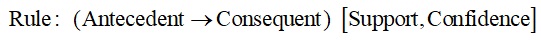· مقياس الثقة Confidence: الذي يمثل احتمال حدوث RHS في حال حدوث LHS، ويحسب من العلاقة Support (LHS U RHS) / Support (LHS)، ويدل هذا المقياس على قوة التنبؤ Predictability power للقاعدة، فكلما كانت قيمته أعلى كانت نسبة نجاح التنبؤ أكبر. من أجل قاعدة ما تدل هذه الخاصية على الاحتمال الشرطي لكون A تعطي B؛ وباستخدام لغة الاحتمالات: