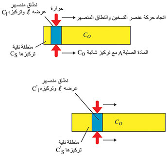 الشائبة Bفي الطور السائل للمادة A أمام النطاق، وفي طورها الصلب خلف النطاق على