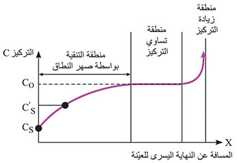 ). وهكذا يزداد تركيز Cl الشائبة Bفي النطاق المنصهر مع تغير مسافته عن بداية العينة (نهايتها اليسرى) حتى التركيزk /Cₒ (Cₒ<k/Cₒ) حيث يتساوى عندها تركيز الجسم الصلب الخارج خلف النطاق المنصهر والداخل إليه (Cs=k Cl = k Cₒ/k = Cl)، أي يتساوى عدد ذرات الشائبة الداخلة إلى النطاق المنصهر والخارجة منه، كما يبقى التركيز ثابتاً في النطاق المنصهر وفي الطور الصلب الناتج منه، وذلك على مسافة عدة أطوال نطاق منصهر مما يشكل مجال نطاق ثباتية (تساوي) التركيزzone leveling الذي يستمر حتى وصول النطاق المنصهر إلى نهاية العينة حيث يتناقص حجم السائل ويزداد تركيز الشائبة B أسّياً عند النهاية اليمنى التي يمكن قصها. يعطي الشكل (3) تغير تركيز الشائبة B بدلالة موقع النطاق المنصهر x على طول العينة حيث يمكن تمييز ثلاث مناطق: منطقة تنقية حيث Cs< Cₒ، ومنطقة تساوي التركيز Cₒ(Cs=k Cl = k Cₒ/k = Cₒ)، ومنطقة نهائية قصيرة يتزايد فيها تركيز الشائبة.
