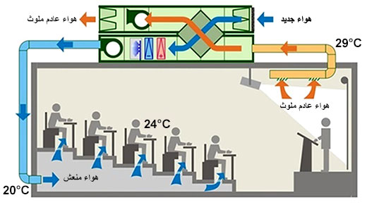 وللاستفادة من الحرارة الصادرة عن الأشخاص يمكن اعتماد منظومة بجريان مضاعف (الشكل 12) تعمل على تسخين الهواء الجديد إلى درجة حرارة °20 س انطلاقاً من درجة حرارة للهواء الفاسد قدرها °29 س، وذلك عند درجة حرارة °24 س لجو القاعة.