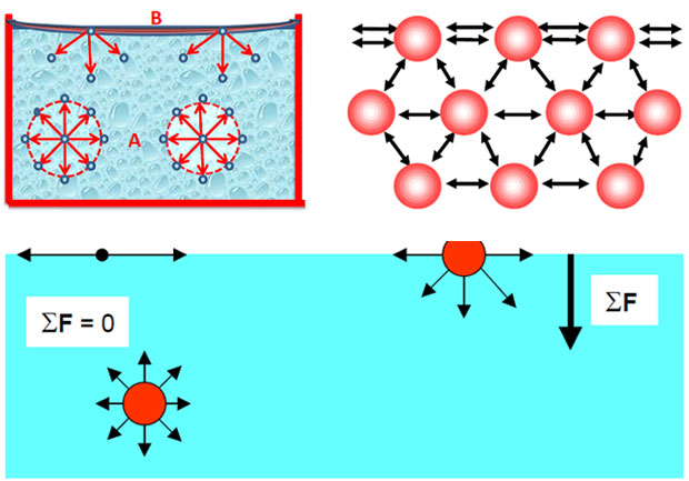، (الشكل 1). في حين تخضع الجزيئات (B)الواقعة عند سطح السائل لتأثير قوى تجاذب من جميع الجزيئات المحيطة عدا الجهة العليا بسبب عدم وجود جزيئات للسائل فوق تلك الطبقة. مما يسبب وجود قوة محصلة غير معدومة تكون جهتها نحو داخل السائل، هذه القوة تكون شدتها عظمى في حال كون الجزيئات الواقعة على سطح السائل تماماً، ومن ثمّ تجعل سطح السائل يميل إلى التقلص والانحناء نحو الأسفل محاولاً إنقاص مساحة سطح هذا السائل.