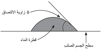 زاوية الالتصاق بين السائل ومادة الوعاء، وهي الزاوية بين سطح الجسم الصلب والمماس لقطرة السائل (الشكل 5). وفي حال كان السائل المستخدم هو الماء المقطر أو الكحول تكون قيمة الزاوية معدومة؛ أي