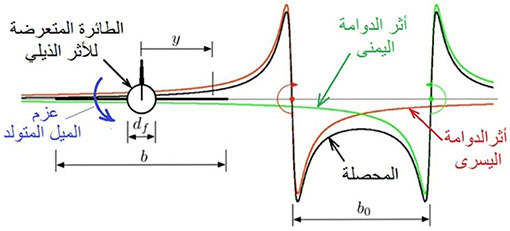 الشكل (7) نشوء عزم الميل عند مرور طائرة ضمن الأثر الذيلي لطائرة أخرى. |