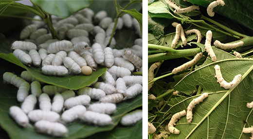 | الشكل (12) دود القز على أوراق التوت الأبيض، وشرانق الحرير. |