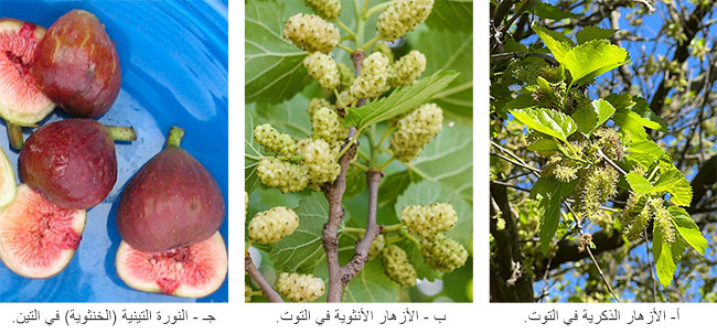 الشكل (4) أشكال الأزهار والثمار في بعض النباتات التوتية. |