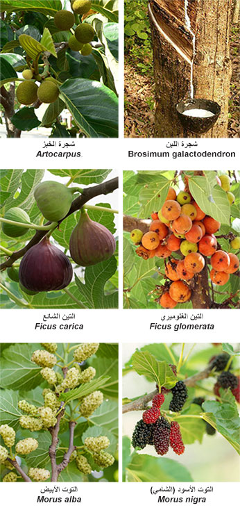 إن أنماط الثمار القابلة للأكل من النباتات التوتية كثيرة (الشكل 9)، مثل: شجرة الخبز Artocarpusالتي تزرع في المناطق المدارية، والتين الشائع Ficus carica، والتين الغلوميري Ficus glomerata، والتوت الأبيض Morus alba، والتوت الأسود Morus nigra(التوت الشامي )، إضافة إلى شجرة اللبن Brosimum galactodendron التي تسيل منها كميات كبيرة من عصارة لبنية لها مذاق الحليب نفسه، وتُستعمل استعمال الحليب في الغذاء، وتنمو هذه الشجرة في فنزويلا.