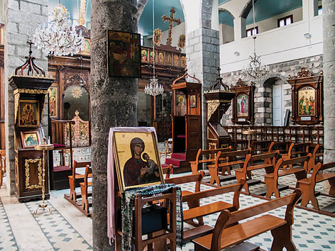 -كنيسة مريم، أو الكاتدرائية المريمية: تقع في مدينة دمشق ضمن السور في شارع الكنيسة، في مدار مركز بطريركية الروم الأرثوذكس، بين طالع الفضة وشارع المنكنة. كان في هذا الموقع- في القرون الأولى للمسيحية- معبد صغير لشيعة المريميين الذين ألّهوا مريم العذراء بوصفها أحد أفراد العائلة الإلهية المقدسة. ولمّا اندثرت هذه الشيعة بعد سنة ٣١٣م؛ آلت كنيستهم إلى الروم الأرثوذكس الذين رمّموها، ووسّعوها. وبعد الفتح الإسلامي أُغلقت، وعُدَّت من أملاك الدولة حتى سنة ٨٨هـ/٧٠٦م حين أعادها الوليد إلى أصحابها بقوله: «إننا نعوّض عليكم عن كنيسة يحيى بكنيسة مريم»، وكان ذلك وفق بعض المؤرخين المسلمين تعويضاً عن كاتدرائية المعمدان. تجدر الإشارة إلى أنه منذ عام ٨٨ هـ/ ٧٠٦م حتى اليوم مرّت على الكاتدرائية أحداث جسام؛ ففي عهد الخليفة العباسي المقتدر بالله سنة ٣١٤هـ/٩٢٦م مع دير النساء الملاصق لها، فأمر الخليفة المذكور بإعادة بنائها من دون البقية. وأُحرقت سنة ٣٣٩هـ/٩٥٠م، و٤٠٠هـ/١٠٠٩م، وهُدمت في سنة ٦٥٩هـ/١٢٦٠م. وكان انتقال المقرّ البطريركي من أنطاكية إلى دمشق سنة ٧٤٣هـ/١٣٤٢م. وضربت هزّة أرضية شديدة معظم سورية سنة ١١٧٣هـ/١٧٥٩م، فأعيد بناء هذه الكنيسة سنة ١١٩١هـ/١٧٧٧م. وجاءت فتنة دمشق الطائفية سنة ١٢٧٧هـ/١٨٦٠م؛ فأُحرقت كل الكنائس، ودُمّرت، وأولها كنيسة مريم، وبجوارها كنيسة كبريانوس ويوستينا وكنيسة مار نقولا والدار البطريركية، وقد أصبحت جميعها أطلالاً ورماداً، فأُعيد إعمارها زمن البطريرك الأنطاكي إيروثيوس (١٢٦٧-١٣٠٣هـ/١٨٥٠–١٨٨٥م)، وقد ضمّت مساحة الكنيستين السابقتي الذكر. وكان الفراغ من بنائها وتدشينها سنة ١٢٨٤هـ/١٨٦٧م، كما تشير اللافتة الرخامية المكتوبة بالعربية واليونانية المثبتة فوق بابها الغربي. وفي زمن لاحق جرت فيها بعض الترميمات والإصلاحات الثانوية، وهذه الكاتدرائية العريقة بموقعها هي أقدم كنيسة ما تزال حية في دمشق.