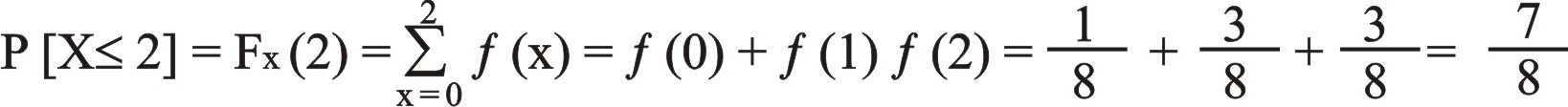 مثال (8) : بالعودة للأمثلة (1ـ 4 ـ 6) فإن احتمال الحصول على ذكرين على الأكثر هو p [X £ 2]n فيمكن بالاستفادة مندالة التوزيع والدالة