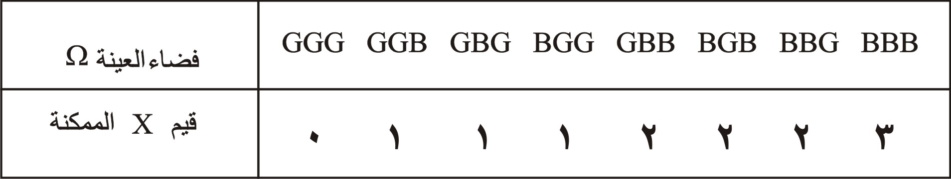 ونلاحظ أن المتغير يأخذ، عند كل نقطة عينة من النقاط الثماني التي يتضمنها فضاء العينة لهذه التجربة، قيمة واحدة فقط من هذه القيم الممكنة والجدول التالي يبين ذلك: