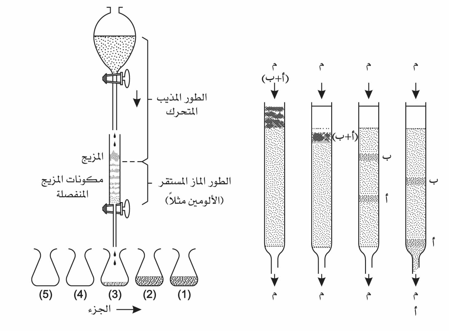 الشكل (1) استشراب الامتزاز في الطور السائل [تظهر أرع مراحل الفصل بشطف جسمين (أ) و(ب) باستعمال المذيب م في عمود من زجاج البيركس مملوء بالألومين] |