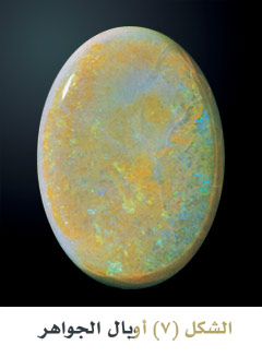 9- الأوبال opal: التركيب الكيمياوي SiO2.nH2O مع شوائب متنوعة تلونه بألوان عديدة، يتميز بأنه غير متبلور يتحول تلقائياً مع مرور الزمن إلى كالسيدوني ومن ثم إلى كوارتز، القساوة 5.5- 6.5، الوزن النوعي 1.9- 2.3، اللون أبيض حليبي أو متنوع بحسب الشوائب الداخلة في تركيبه (الشكل- 7). من أشهر جواهره: