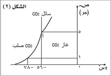 ويتبين كذلك من منحني الانصهار ن هـ أن الجسم لاينصهر، أي يتحول إلى سائل إذا كان الضغط الواقع عليه أقل من ضغط النقطة الثلاثية لهذا الجسم، أي إنه يتحول مباشرة إلى بخار، أي يتصعَّد. ويتضح هذا أكثر ما يتضح في حالة الزرنيخ وأكاسيده، إذ إن ضغط النقطة الثلاثية لها أعلى من الضغط الجوي، لذلك فهي لا تنصهر، وتتحول تحت الضغط الجوي مباشرة إلى بخار. وإذا سُخِّنت في وعاء مغلق فإن ضغط أبخرتها يزداد بازدياد درجة الحرارة، وحين تصل قيمته إلى قيمةٍ أعلى من ضغط النقطة الثلاثية يحدث الانصهار، ويحدث مثل ذلك لثاني أكسيد الكربون CO2 الذي يُحفظ وهو سائل في أسطوانات فولاذية تحدث ضغط شديد مقداره نحو (60) جو، في درجة الحرارة العادية. فإذا فُتح صنبور الأسطوانة ليتسرب منها السائل انخفض الضغط إلى الضغط الجوي وانخفضت في الوقت نفسه درجة حرارة ثاني أكسيد الكربون بسبب التبخر السريع، فتقع النقطة الممثلة لحالته على منحني التصعد حيث لا يكون هناك توازن إلا بين الجسم الصلب وبخاره، ويتكون مايسمى الثلج الكربوني أو الجليد الصلب الجاف الذي يتبخر من دون أن يمر بالحالة السائلة، وتكون درجة حرارة التصعد - 87ْس تحت الضغط الجوي، انظر الشكل (2)، وبذلك يمكن الحصــول بالثلج الكربوني على درجة حرارة منخفضة معينة بدقة، وهو أصلح ما يكون لغرض التبريد، لأنه لا يبلل الأشياء التي يبرِّدها كما يحيط المادة المبَّردة بغلاف من غاز CO2 يفيد في عزلها. غير أن ثاني أكسيد الكربون يمكن أن ينصهر في الدرجة 65ْس تحت ضغط مقداره نحو (5) جو كما هو مبين في الشكل (2).