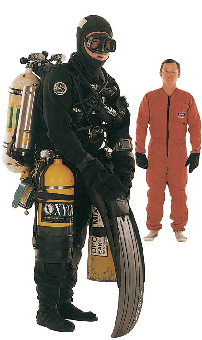 × بزة جافة dry suit مصنوعة من مادة مانعة لنفوذ الماء ومحكمة، لا تسمح بتسرّبه إلى بدن الغواص، وغالباً ما يرتدي تحتها لباساً صوفياً يدفئ الجسم.
