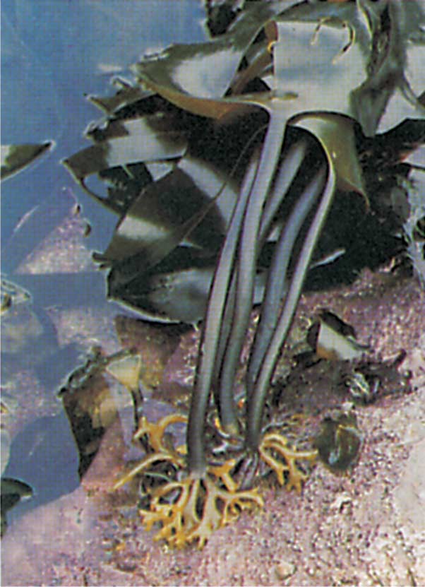 الشكل (3)طحلب الاميناريا Laminaria الأسمر وجذرياته المثبتة على الصخور البحرية المقاومة لحركات المائية العنيفة