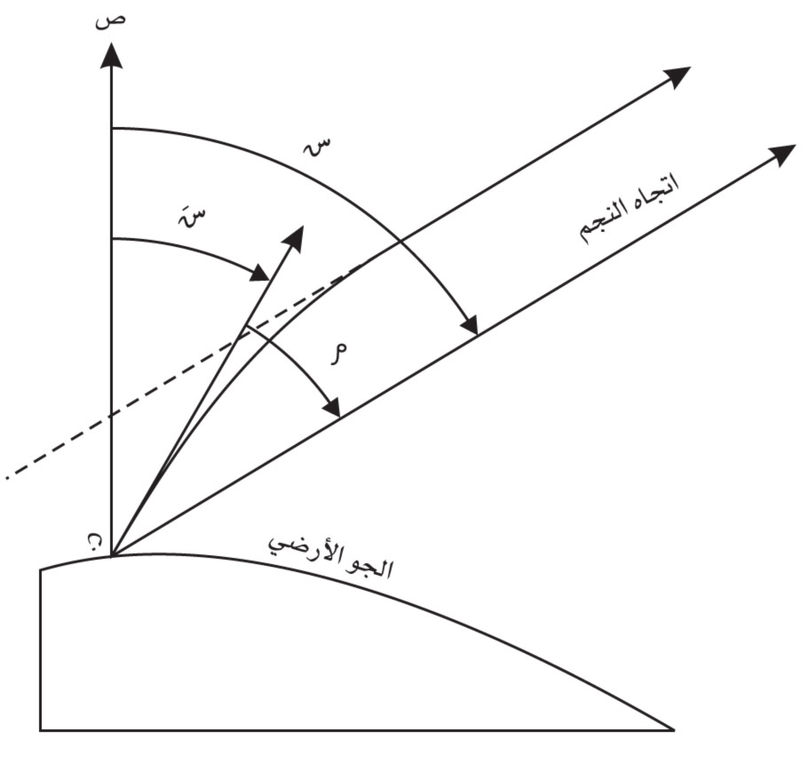إذا رمز للبعد السمتي الحقيقي بـ ص وللبعد السمتي المرصود بـ صَ، فإنه ينتج بالنظر إلى المثلث ا م نَ (الشكل 10)