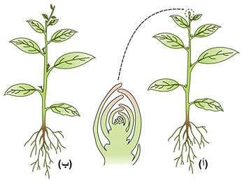 | (أ): نبات ببرعم قمي سليم. (ب) نبات ببرعم قمي منزوع. |