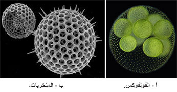 مثالها الفولفوكسVolvox globator وبعض المنخرباتForaminifera مثل Radiolaria sp. من الحيوانات الأوالي Protozoa (الشكل 5). تعيش الحيوانات الأوالي في مستعمرات كروية الشكل يصل قطرها نحو1 مم، ترتبط الخلايا المتجاورة بعضها ببعض بضفائر سيتوبلاسمية، وتقسمها محاور وخطوط ومستويات كثيرة. تتحرك المستعمرة بوساطة سياط متدحرجة في جميع الاتجاهات.