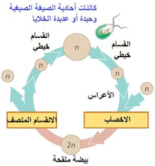 | الشكل (2) دورة الحياة أحادية الصيغة الصبغية لدى معظم الفطريات والعديد من الأوالي (وحيدات الخلية). |