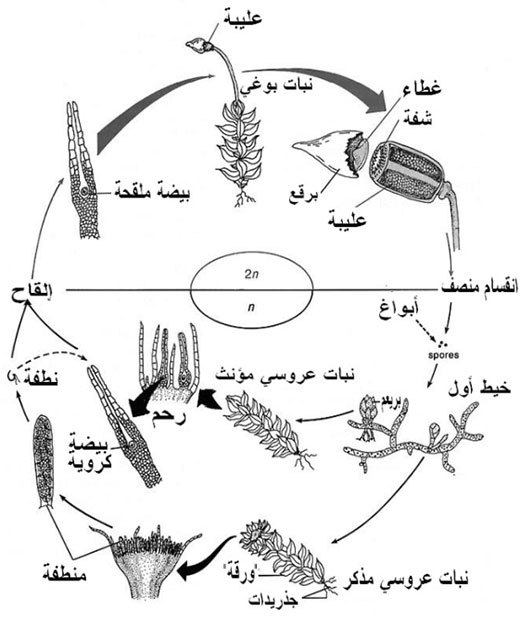 الشكل (5) دورة حياة البريويات ممثلة بنبات الفوناريا Funaria sp.:يُلاحظ سيطرة النبات العروسي على النبات البوغي الذي لا يستطيع العيش مستقلاً عنه.