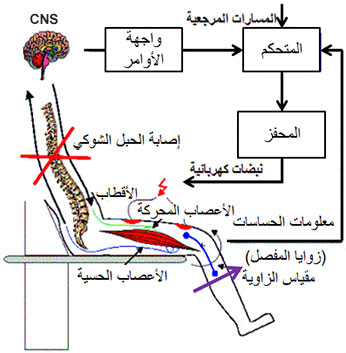ه- المتحكم: العنصر الرئيسي في الجهاز؛ فمن خلال تحديد أسلوب التحكم تتحدد الحساسات والأقطاب وأنماط نبضات التنبيه المستخدمة في تحريك العضلات، ويعمل على معالجة إشارات الحساسات والاستفادة منها في اختيار أنماط التنبيه المناسبة.